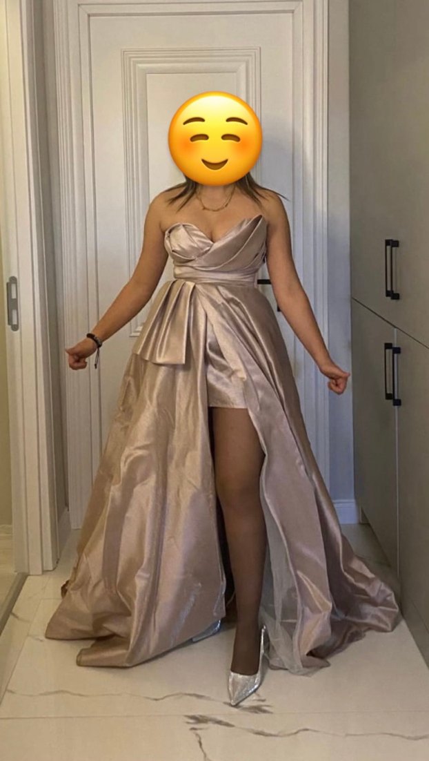 Toz pembe renkli, straplez yakalı ve drapeli detaylara sahip uzun abiye elbise. İnce kesimi ve parlak kumaşıyla modern ve şık bir görünüm sunar.
