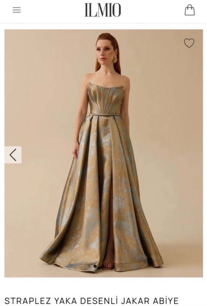 Bej renkte, straplez kesime sahip uzun abiye elbise. Drapeli tasarımı ve parlak dokusuyla modern klasik stil sunar. Düğünler için uygun, kolsuz ve desensiz şık bir model.