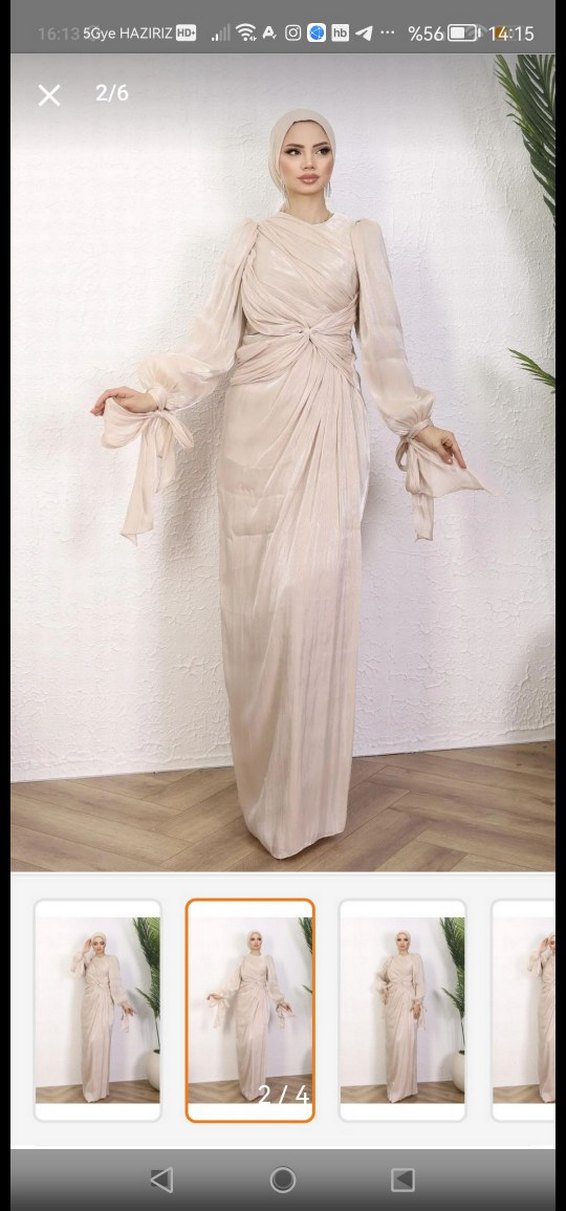 Bej renkte, drapeli detaylara sahip uzun abiye elbise. Uzun kollu, bağcıklı ve bol kesimdir. Straplez yaka ve vintage bohem tarzıyla düğünler için uygundur.
