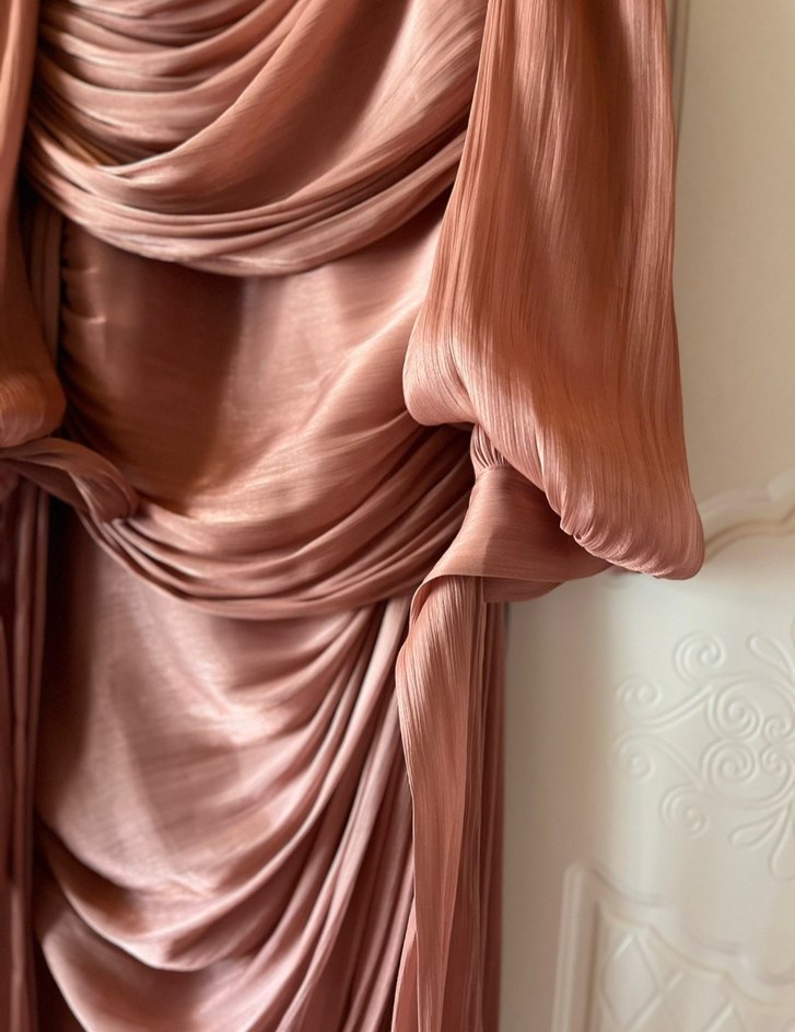 Fitted kesim, straplez yaka ve ince askılı kollara sahip bej abiye elbise. Parlak kumaşı drapeli ve modern klasik tarzda, düğün için uygundur. ✨