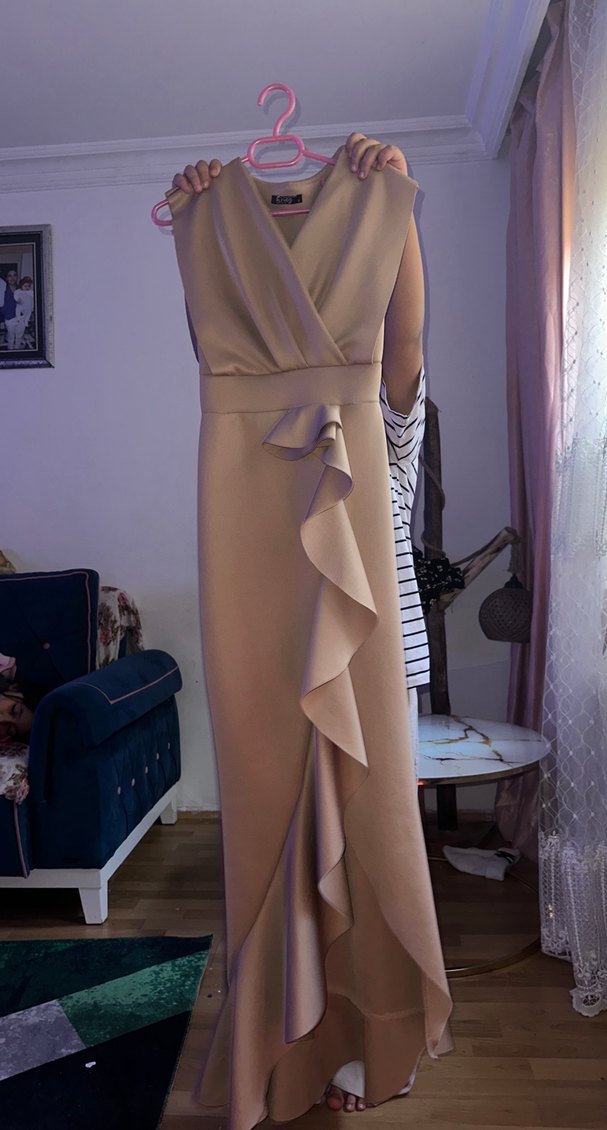Bej renkte, V yakalı ve kolsuz uzun abiye elbise. Drapeli tasarımı ve regular kesimi ile düğünler için uygundur. Desensiz, modern Paris tarzı.