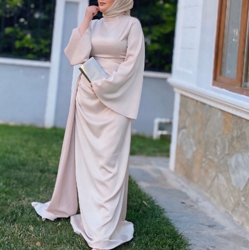 Bej renkte, uzun kollu ve yüksek yakalı drapeli abiye elbise. Düz ve sade yapısıyla minimal, modest bir görünüm sunar. Düğün için uygundur. ✨