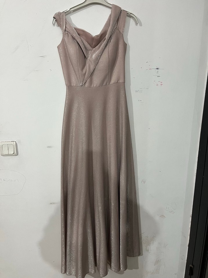 Bej renkte, drapeli V yaka ve kolsuz, klasik şıklıkta uzun ve dar kesim abiye elbise. ✨