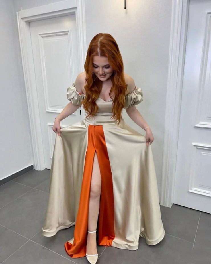 Bej renkte, drapeli uzun abiye elbise, straplez yaka. Düğünler için modern klasik tarzda, rahat kesimlidir. Ablamın kınasında 1kez giyildi özel dikim türkiyede aynısı yoktur