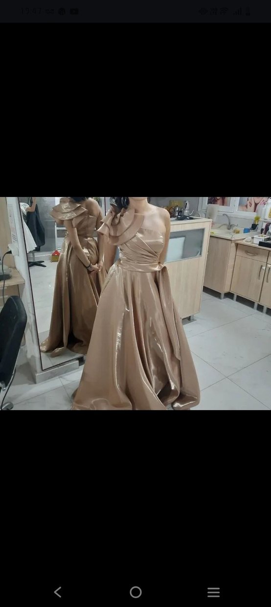Bej renkte, straplez yaka ve drapeli tasarıma sahip uzun abiye elbise. Parlak kumaştan, regular fit ve askılı kollu, düğün ve özel günler için uygun. ✨