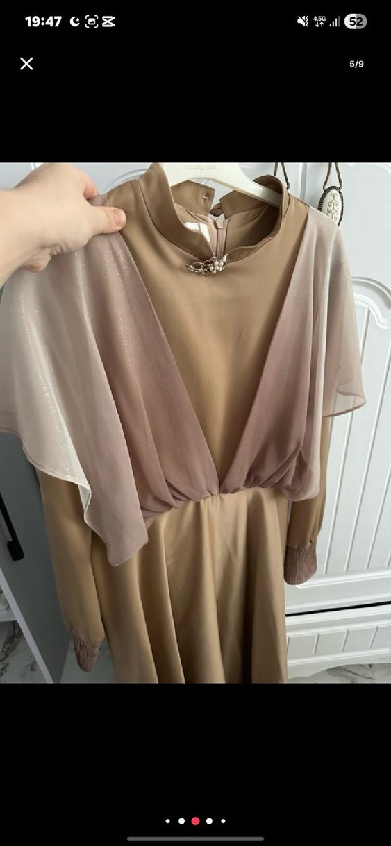 Bej renkte, drapeli uzun elbise. Yüksek yakalı, uzun kollu ve ipeksi dokusuyla düğünler için uygun etnik desenli klasik model.Setrms den alındı ayakkabı ve şql da verilecektir