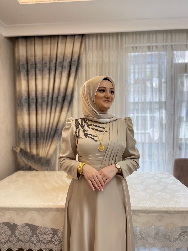 Bej renkte, etnik desenli, yüksek yakalı ve uzun kollu, drapeli detaylı, düzenli kesim uzun abiye elbisedir. Düğünler için uygundur. Şal dahildir✨
