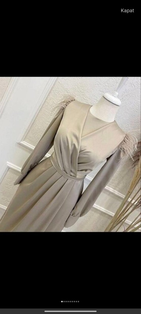 Bej renkli, drapeli detaylara sahip uzun abiye elbise. V yaka ve uzun kollu, düzenli kesim ile klasik ve gösterişli bir şıklık sunar. ✨