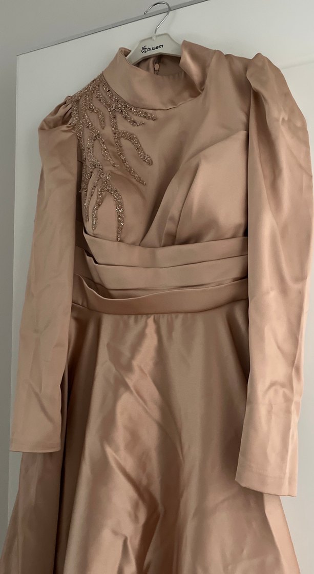 Drapeli ve işlemeli detaylara sahip, yüksek yakalı, uzun kollu bej abiye elbise. Klasik ve şık bir görünüm sunar. ✨
