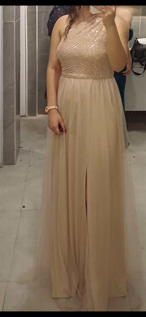 Bej renkte, askılı ve drapeli üst kısmı olan bu uzun abiye elbise, önünde yırtmaç bulunan dökümlü etekle modern klasik şıklığı yansıtıyor. ✨ 1 defa giyildi tek omuz