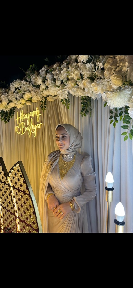 Bej renkte, yüksek yakalı ve uzun kollu, drapeli tasarıma sahip etnik desenli uzun abiye elbise. Düzenli kesimi ve gösterişli, mütevazı tarzıyla düğünlere uygun.