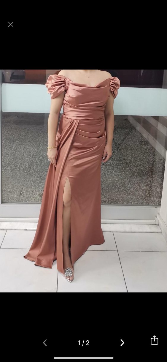 Drapeli ve tek omuz askılı, tek renk parlak bej uzun abiye elbise. Tek yırtmaçlı, tekne yaka ve vücuda oturan kesimle modern klasik tarzda.