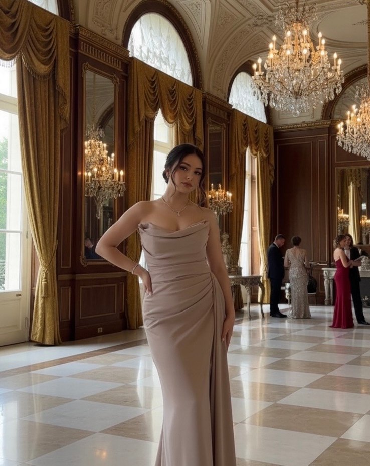 Bej renkte, drapeli ve askılı kollu uzun abiye elbise. Modern klasik tarzda, regular fit kesime sahip, düğünler için uygun bir model. En sonda giyilmis hali var