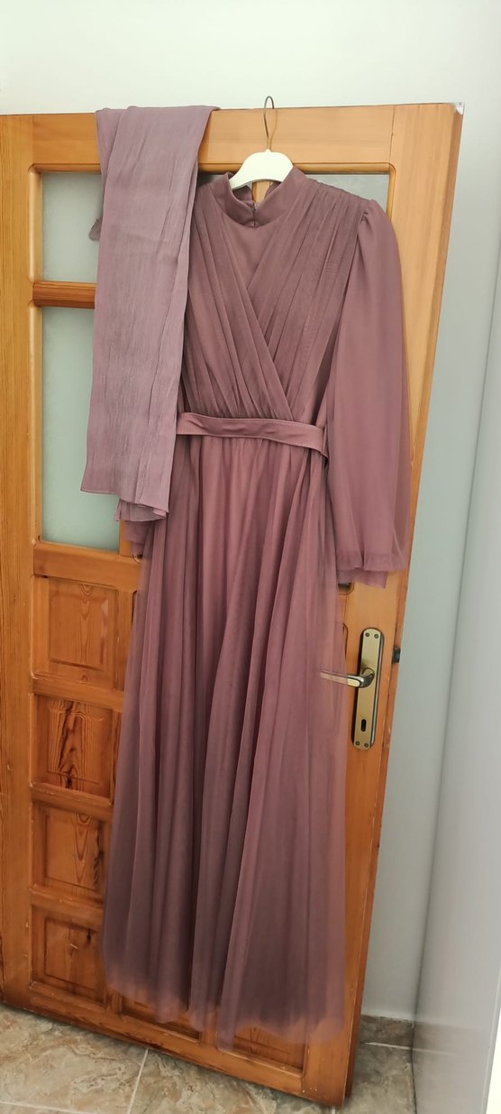 Bej renkli, drapeli ve bol kesim uzun abiye elbise, askılı kollu ve yakası notched lapel, düğünler için uygun.