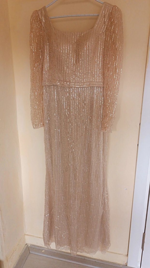 Bej renkte, tek renk, drapeli uzun abiye elbise. Tekne yaka ve klasik ve modern bir şıklık sunar. Düğünler için uygundur. ✨ nişanda bı defa giyildi saç aksesuarı ile birlikte gönderilecektir 36-38 beden uygundur