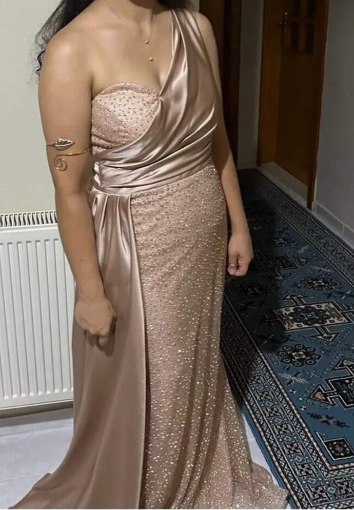 Bej renkte, straplez yaka ve askılı kollu, drapeli uzun abiye elbise. Parlak kumaş ve yılan deseniyle modern klasik tarzda, düğünler için uygun. ✨
