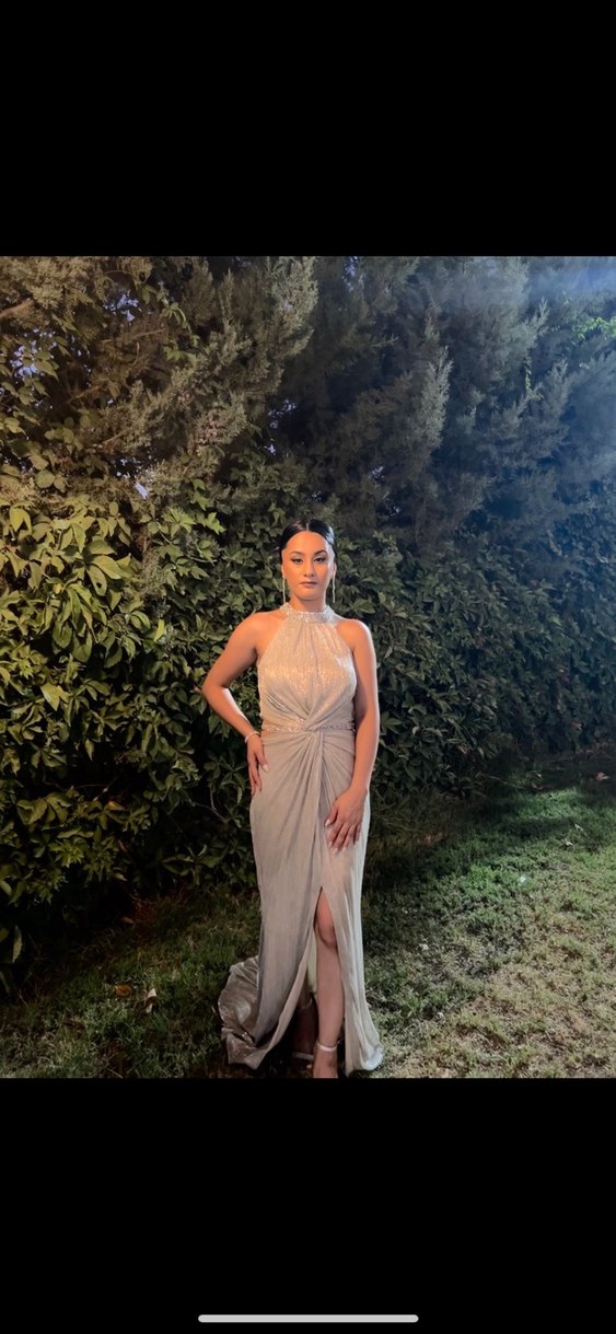 Bej renkte, drapeli ve yüksek yakalı, kolsuz, klasik şıklıkta uzun ve vücuda oturan abiye elbise. 45-60 kiloya kadar giyilebilir boy 1.60-175 olarak kullanılabilir ilk görselde görüldüğü gibi uzun