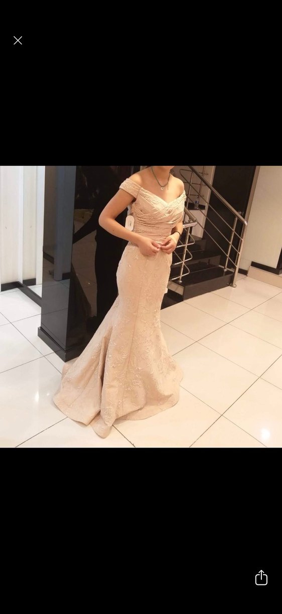 Bu bej renkli, uzun ve vücuda oturan elbise, drapeli detaylara, kayık yaka ve ince askılara sahiptir.