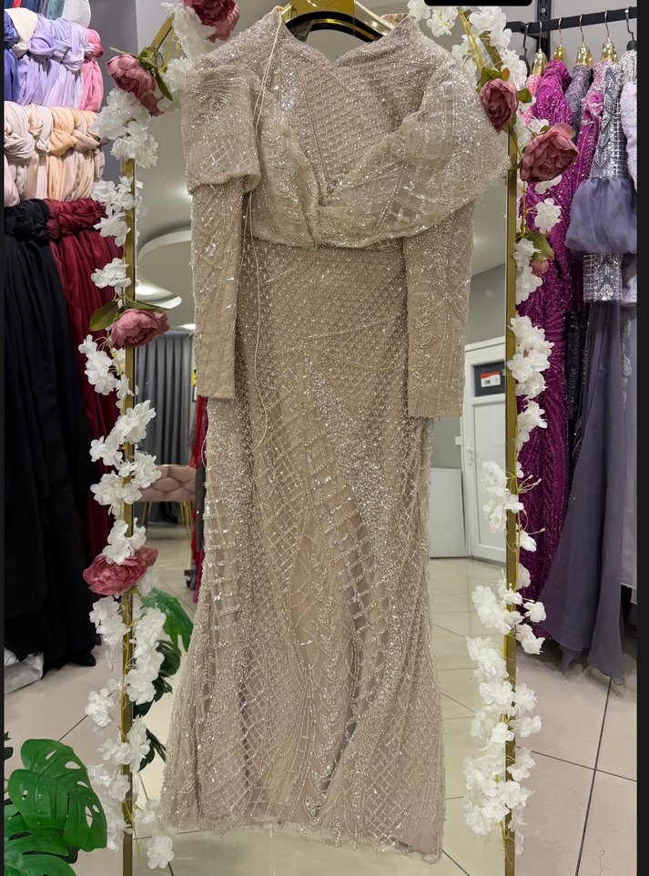 Bej renkli, drapeli uzun abiye elbise, kayık yaka ve uzun kolludur. Düzenli kesim ve hafif yılan desenine sahiptir, şık düğünler için idealdir. ✨ 36 40 beden uyumlu