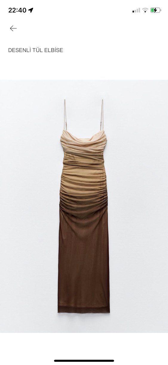 Drapeli tasarımı, ince askıları ve straplez yakasıyla bej tonlarında uzun, vücuda oturan elbise. Pürüzsüz sentetik kumaştan, romantik akşamlar için uygun.