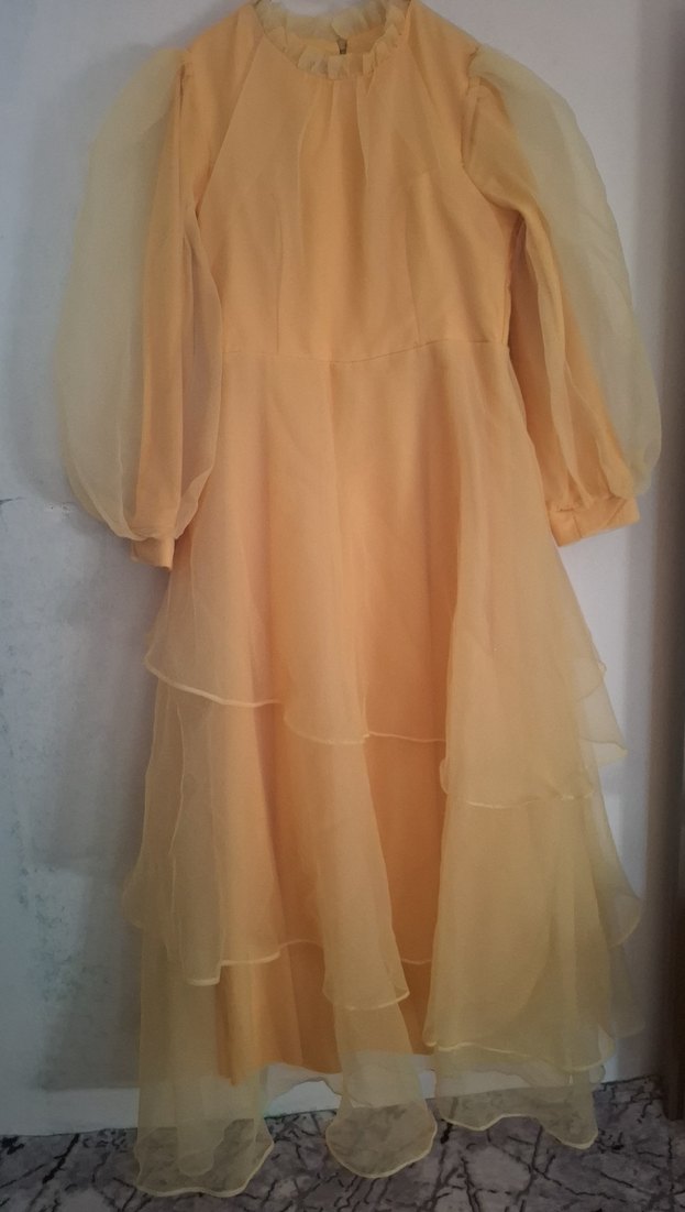 Bej renkte, drapeli katmanlara ve uzun kollara sahip uzun elbise. Salaş kesimi ve yuvarlak yakası ile bohem tarzda, düğünlere uygun bir modeldir. Elbise hiç giyilmedi 46 bedendir
