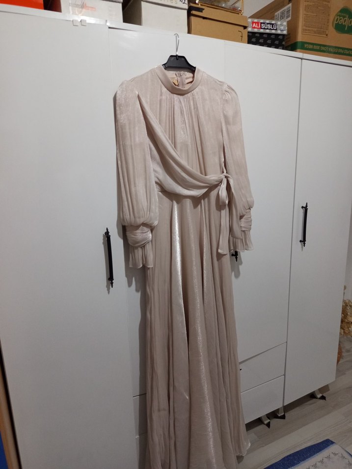 Bej renkte, yüksek yakalı ve drapeli tasarıma sahip uzun abiye elbise. Salaş kesimi ve klasik modern tarzıyla düğünler için uygun.