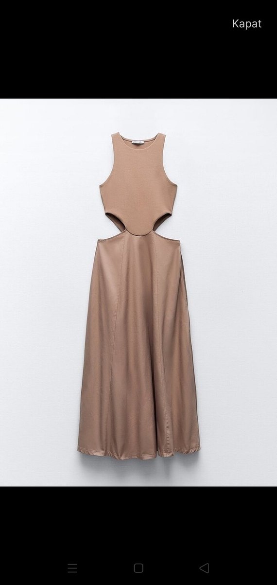 Bej renkte, kolsuz, drapeli ve straplez yakalı uzun kadın elbisesi. Minimalist ve çağdaş tarzda, vücuda oturan kesime sahiptir.