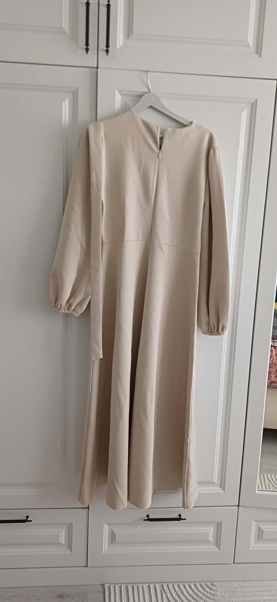 Bej uzun elbise, drapeli tasarımı ve bol kesimiyle dikkat çeker. uzun kolludur, modern Sentetik, pürüzsüz kumaş scuba kullanılmıştır. balon koldur