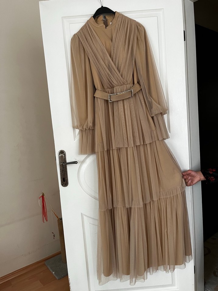 Bej renkte, yüksek yakalı, drapeli ve askılı uzun kadın elbisesi. Bol kesimli ve kemerli, ofis ortamına uygun şık tasarım. Kemeri biraz deformasyon ama bağlanınca belli olmuyor bir kez tek giyildi 38 -40 beden