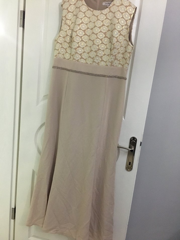 Bej renkte, drapeli uzun kadın elbisesi. Kolsuz ve straplez yakaya sahip, üst kısmı parlak desenli kumaş, alt kısmı ise düz ve akıcıdır. Düğünler için uygundur.
