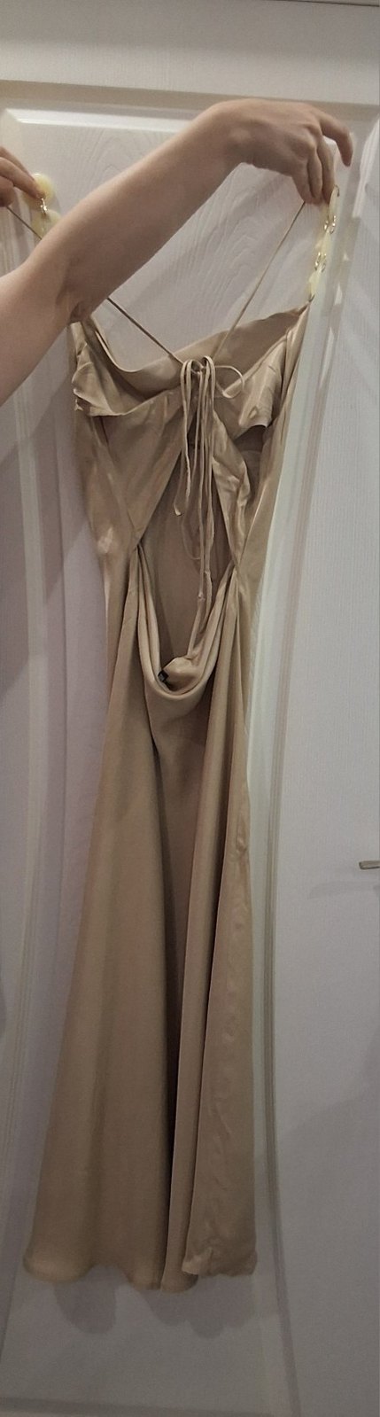 Saten görünümlü kumaştan yapılmış, drapeli ve halter yakalı bej uzun elbise. Kolsuz ve vücuda oturan kesimiyle düğün için ideal bohem tarzda.