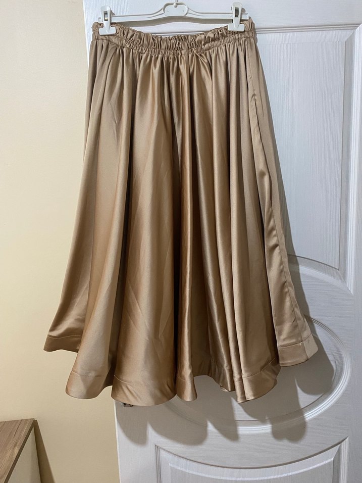 Bej renkte, drapeli ve bol kesimli uzun etek. İpeksi kumaştan üretilmiş, parlak ve çağdaş bir görünüm sunar.