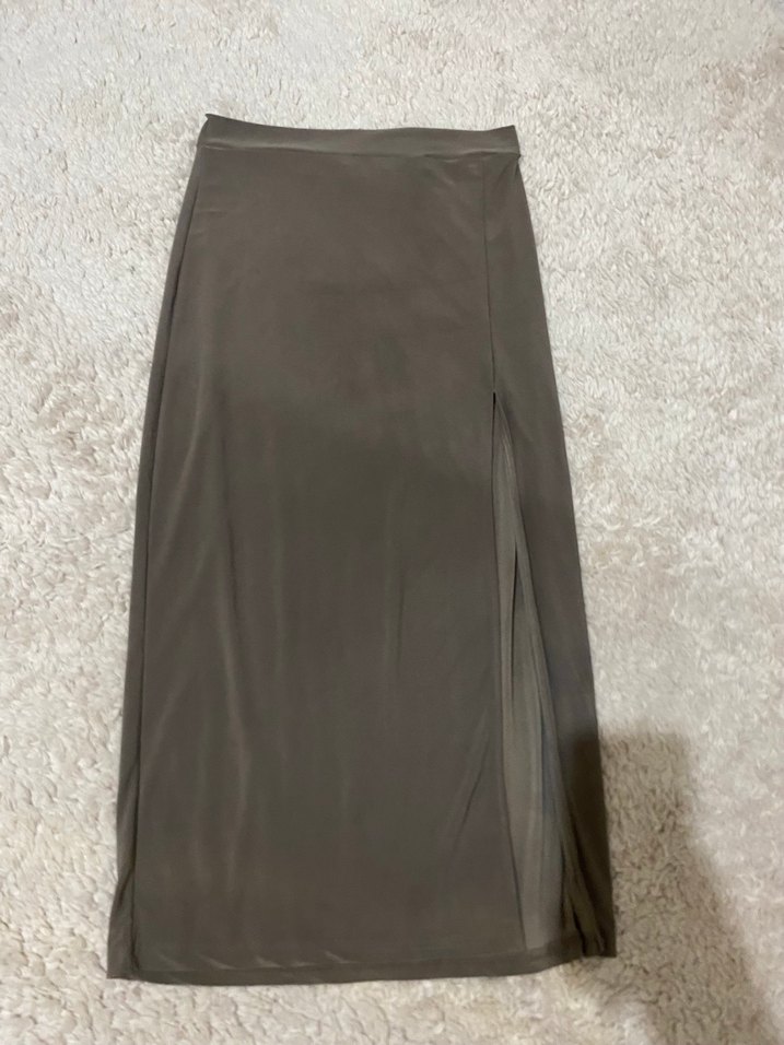 Drapeli detaylı, düz bej renkte, sentetik kumaştan yapılmış uzun ve vücuda oturan kadın eteği.