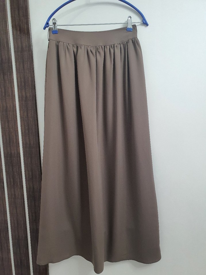 Bej renkli, drapeli ve bol kesim uzun kadın eteğidir. Yumuşak pamuk kumaştan yapılmıştır ve günlük kullanıma uygundur. bedeni olmadığı için hiç kullanılmadı.