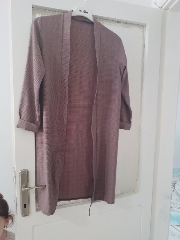 Bej renkte, drapeli uzun kadın kaban. Notch yakalı, uzun kollu ve rahat kesim. Yumuşak sentetik kumaştan üretilmiştir.