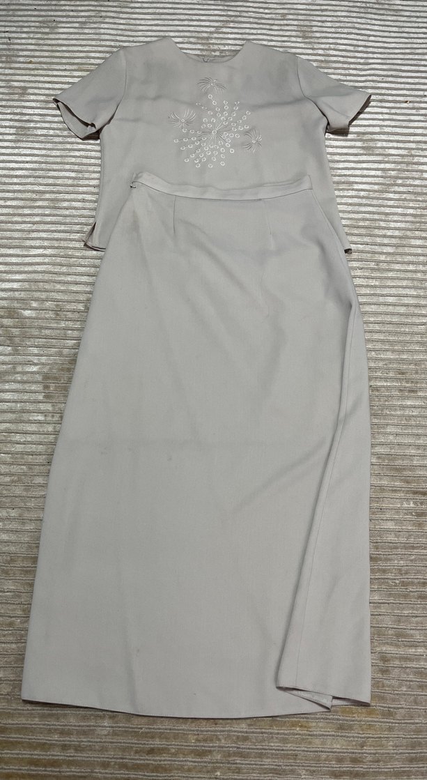 Uzun bej takım kayık yaka tasarımı ile drapeli detaylara sahiptir. Minimalist ve klasik bir görünüm sunar,
