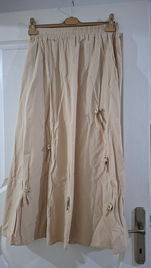 Bej renkte, keten kumaştan yapılmış, bol kesim ve drapeli tasarıma sahip uzun etek. Minimalist ve bohem tarzda, günlük kullanım için uygundur. Tek kusuru ufak bir lekesi var geçmiyor fotoğrafta mevcut lekesi