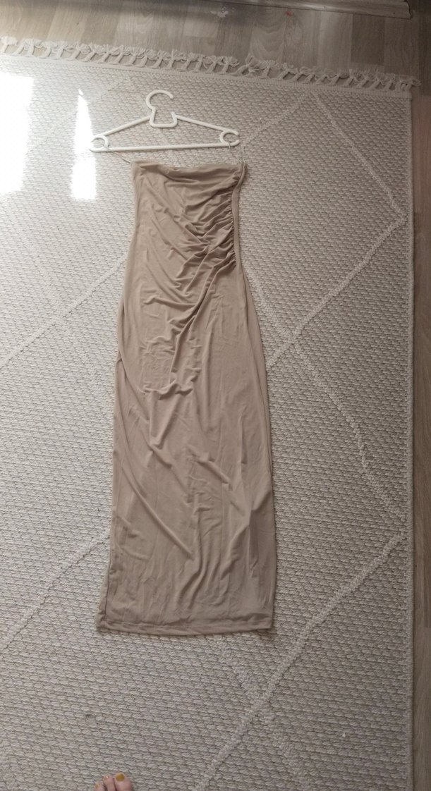 Bej renkte, keten kumaştan yapılmış uzun, straplez ve drapeli elbise. Minimalist ve bohem tarz için uygun, kolsuz ve vücuda oturan kesime sahiptir.