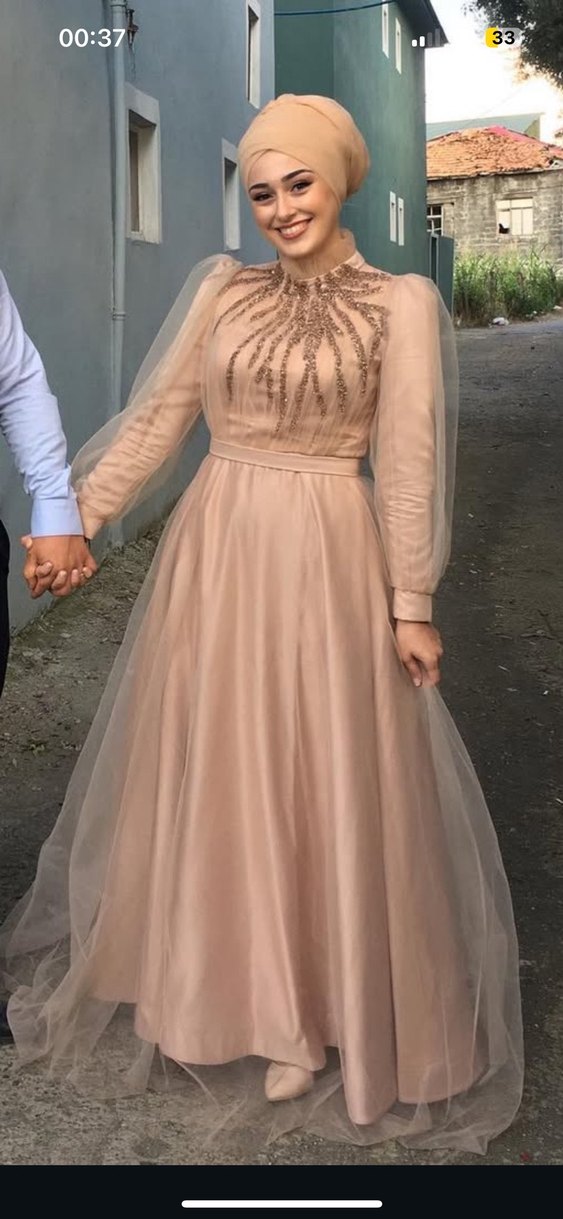 Bej renkli, uzun kollu ve yüksek yakalı drapeli, klasik kesim, fit oturan nişan elbisesi. Düğünler için uygun, desensiz ve zarif bir model. Ürün 2 kez kullanılmıştır.