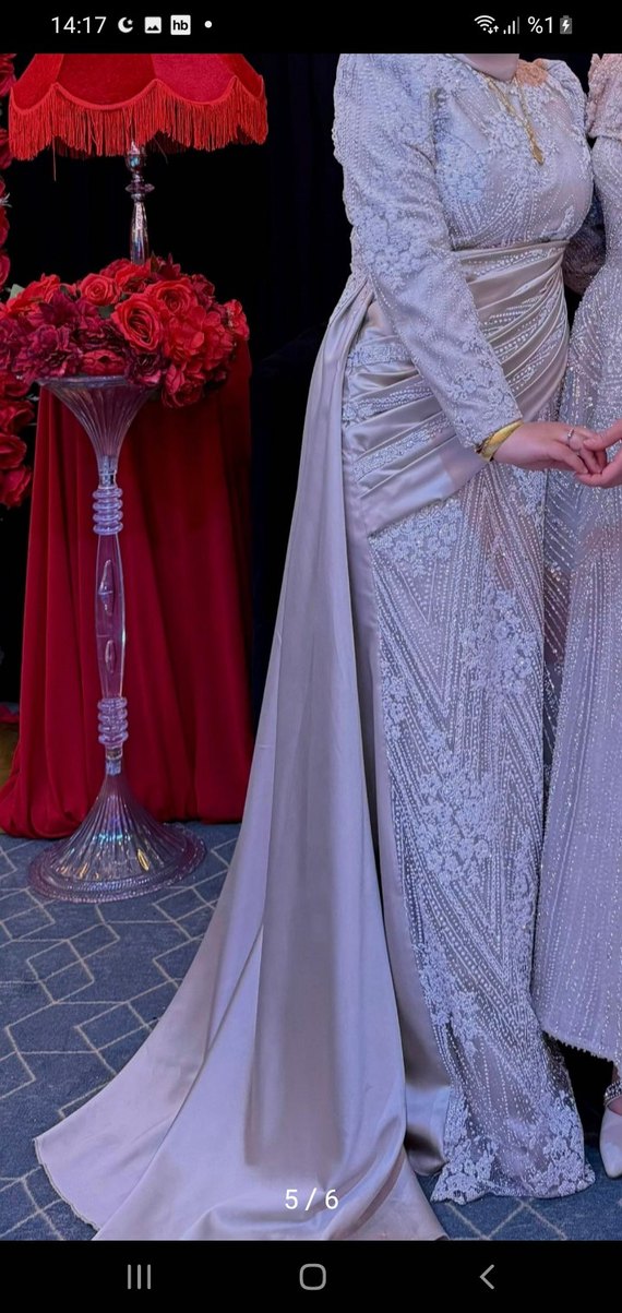Desenli ve drapeli detaylara sahip, uzun kollu ve klasik kesim bej uzun abiye elbise.ayakkabisi yaninda hediye 1000 kiralik