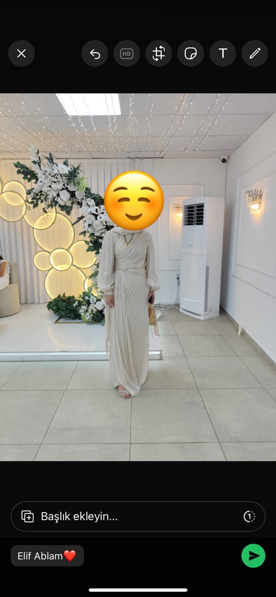 Bej renkte, yüksek yakalı ve uzun kollu, yumuşak sentetik kumaştan yapılmış uzun elbise. Drapeli tasarımı ve düzenli kesimi ile sade ve modern düğünlere uygun.