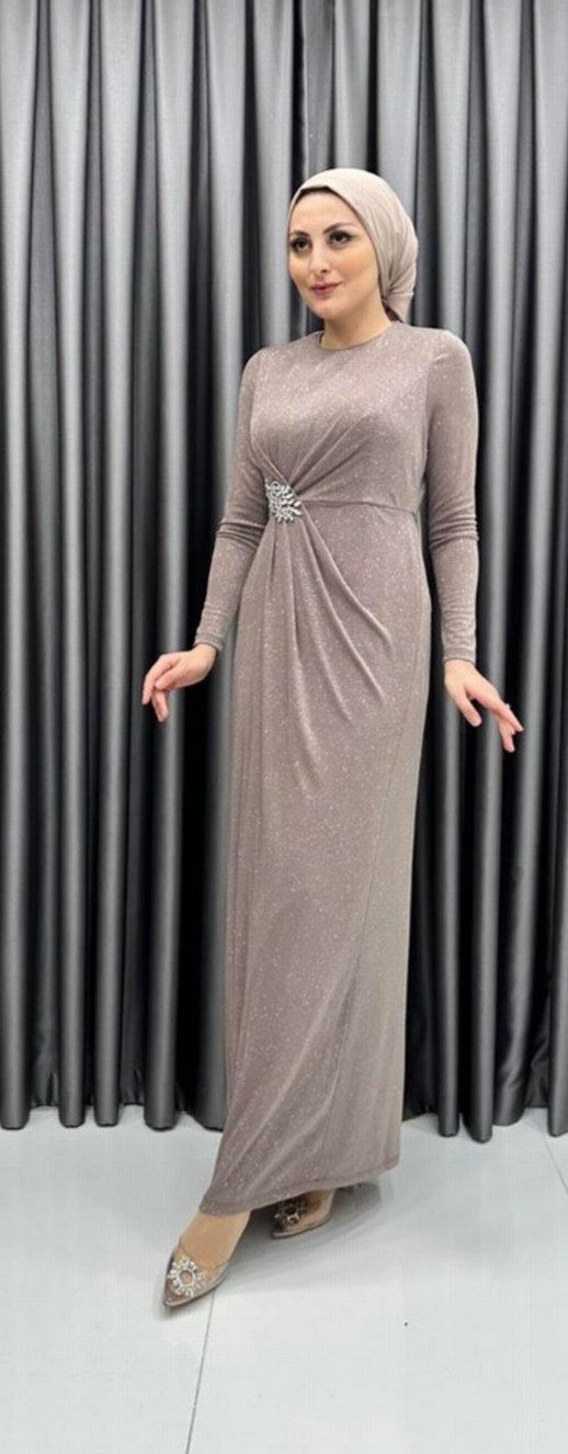 Bej Drapeli Uzun Kollu Abiye Elbise