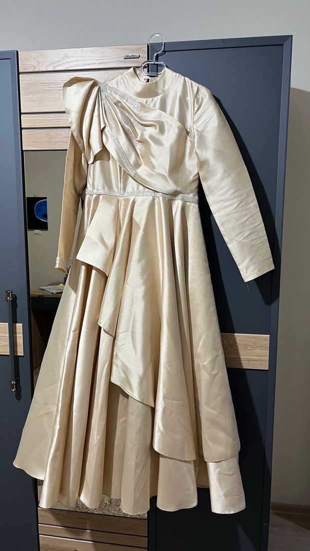 Uzun, bej renkli, drapeli tasarıma sahip, tek düze parlak kumaştan yapılmış, tekne yaka ve uzun kollu, vintage dokunuşlu klasik şıklıkta abiye elbise. Fermuarı bozuk sadece yaptırılır