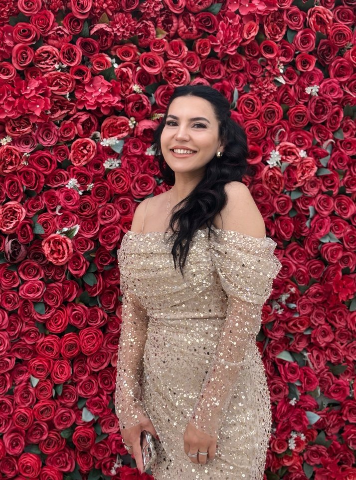 Bej renkli, uzun kollu ve drapeli tasarıma sahip klasik şıklıkta, desenli, uzun boy abiye elbisedir. Yaka tipi kayık, vücuda oturan kesimlidir. Bir kere giyildi cok iyi durumda kardesimn düğünde giydim