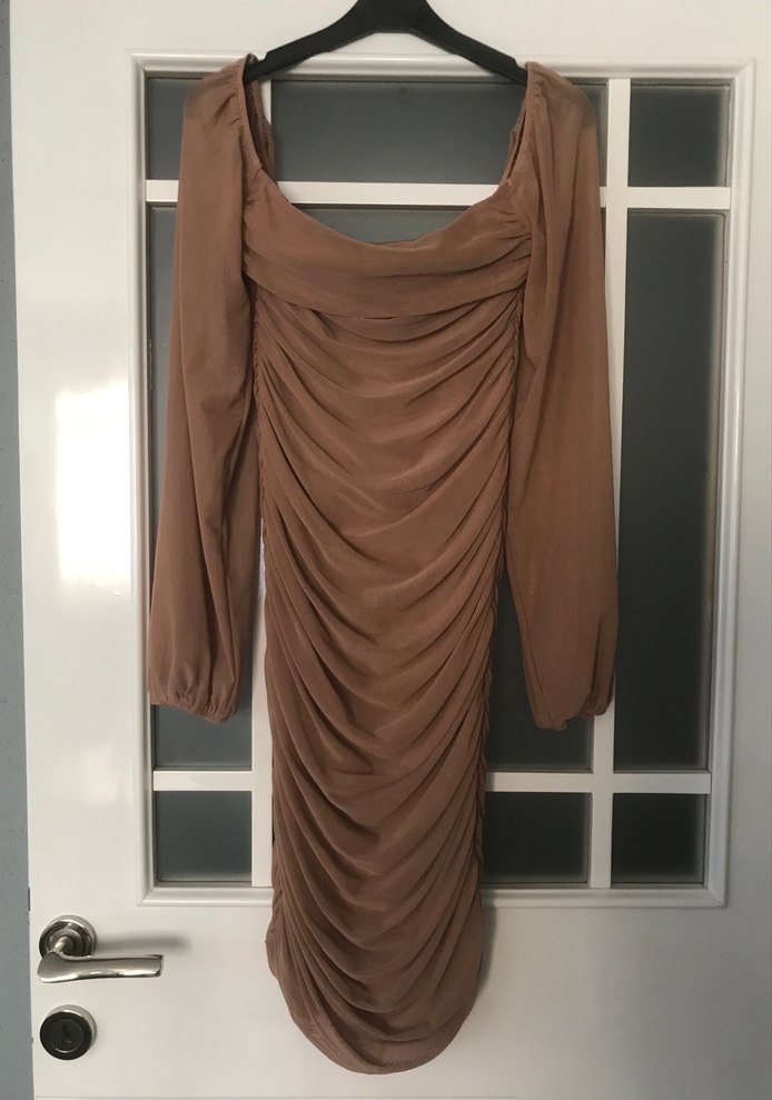Bej renkte, uzun kollu, tek parça drapeli ve tekdüze uzun abiye elbise, tekne yaka ve vücuda oturan kesime sahiptir.