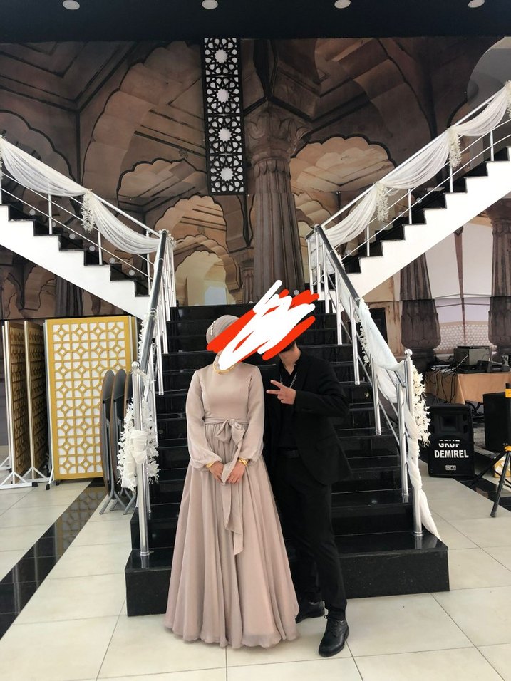 Bej Drapeli Uzun Kollu Abiye Elbise
