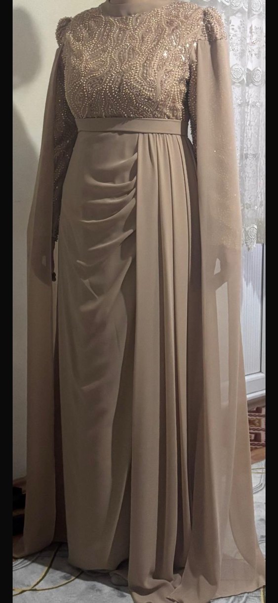 Bej renkte, bisiklet yakalı, uzun kollu ve drapeli tasarıma sahip klasik şıklıkta uzun abiye elbise. Düz renk ve düzenli kesimle düğünler için uygun. 46 beden olduğuna bakmayın normalde ben 42 beden giyen biriyim dar kalıptır