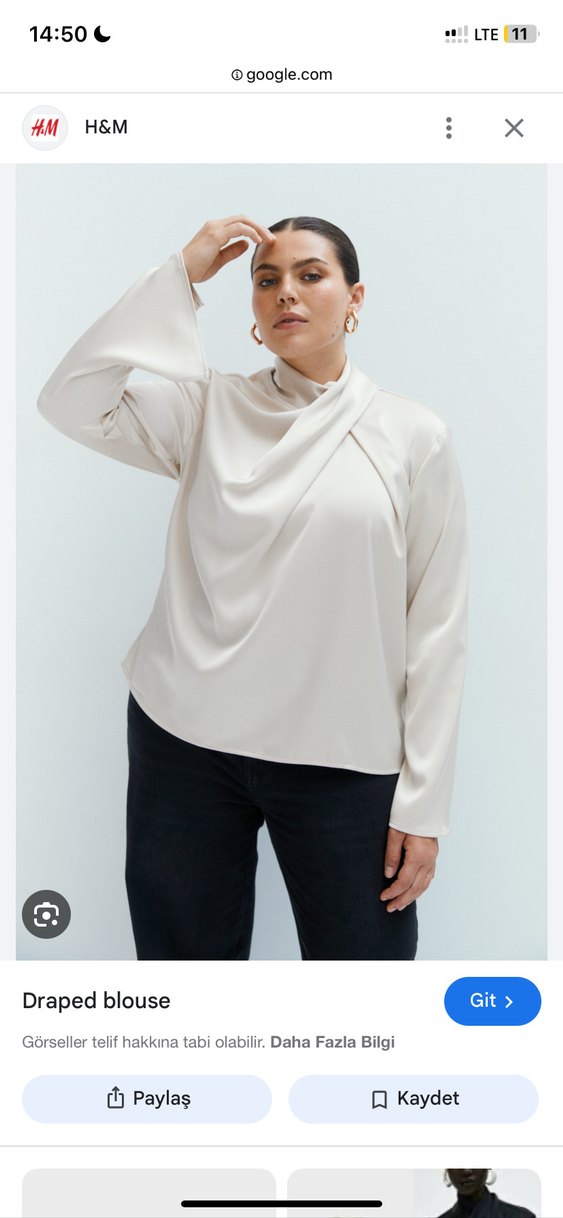Bej renkte, uzun kollu ve yüksek yakalı drapeli kadın bluz. Ofis için uygun, minimalist ve rahat kesim.