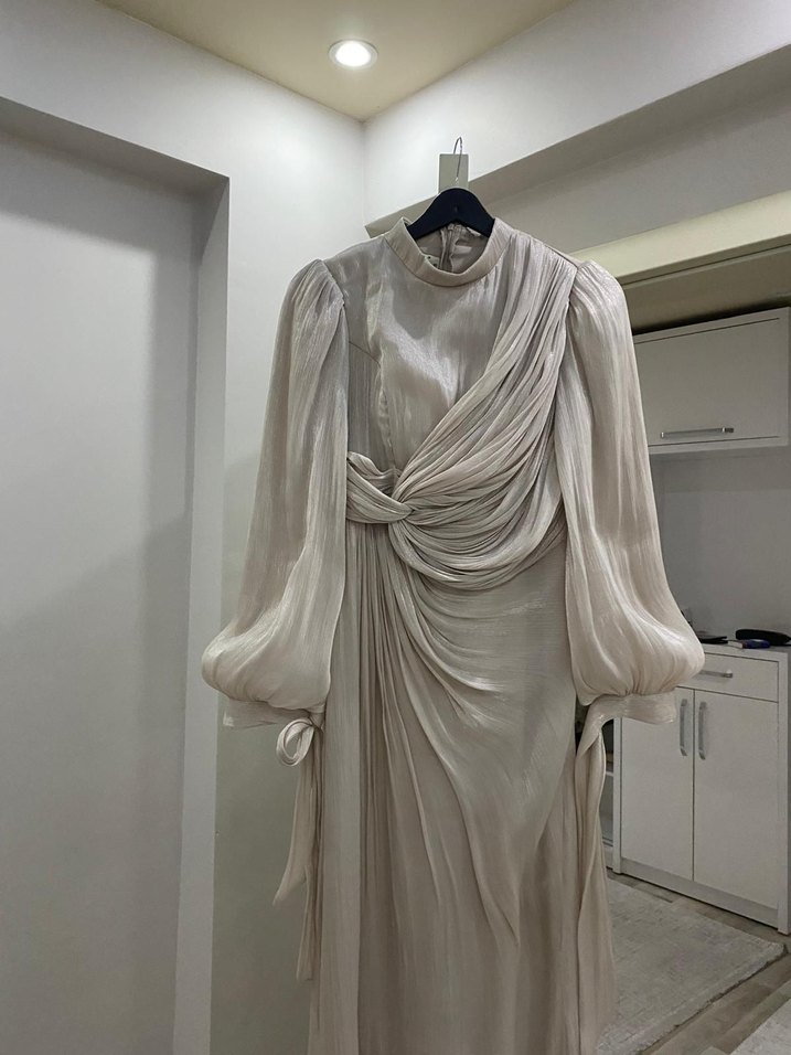 Bu dar kesim kadın abiye, yüksek yakalı ve uzun kollu olup drapeli detaylara sahiptir. Bej-gri tonları ve modern klasik tarzıyla düğünler için uygundur.