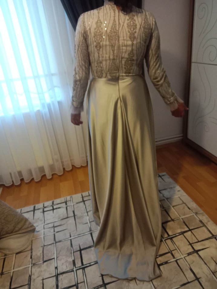 Bej renkli, drapeli ve uzun kollu bu dar kesim abiye elbise, V yakalı ve parlak kumaşlıdır. Klasik vintage tarzıyla düğünler için uygundur.